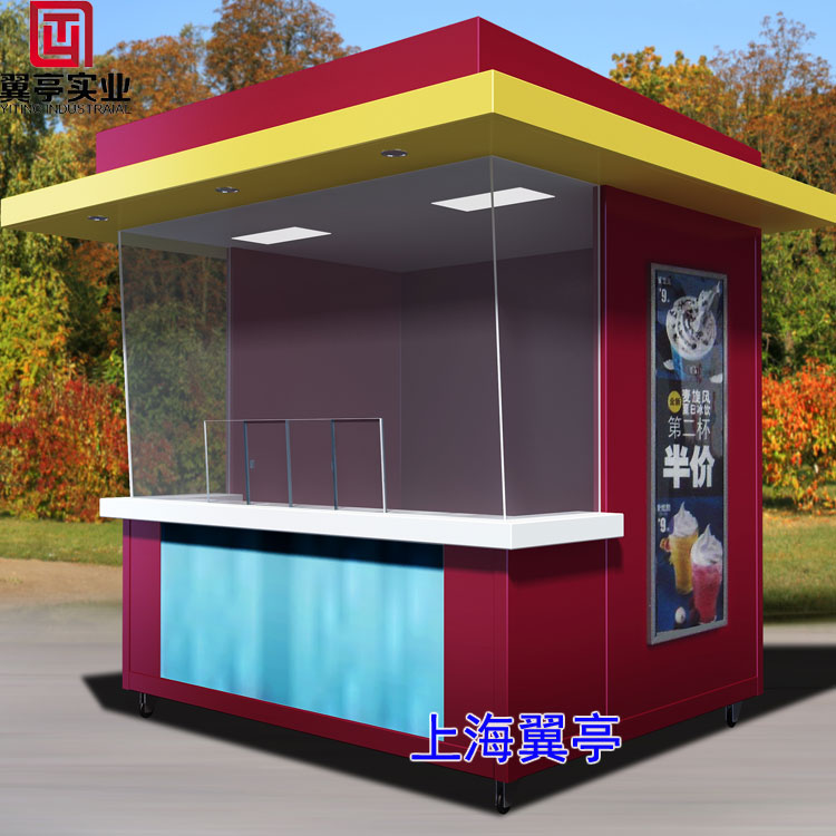 4.整體設計美觀大方:售賣亭正面設有售貨窗口、采用整塊鋼化玻璃,且設有專用售貨臺(含收銀抽屜)